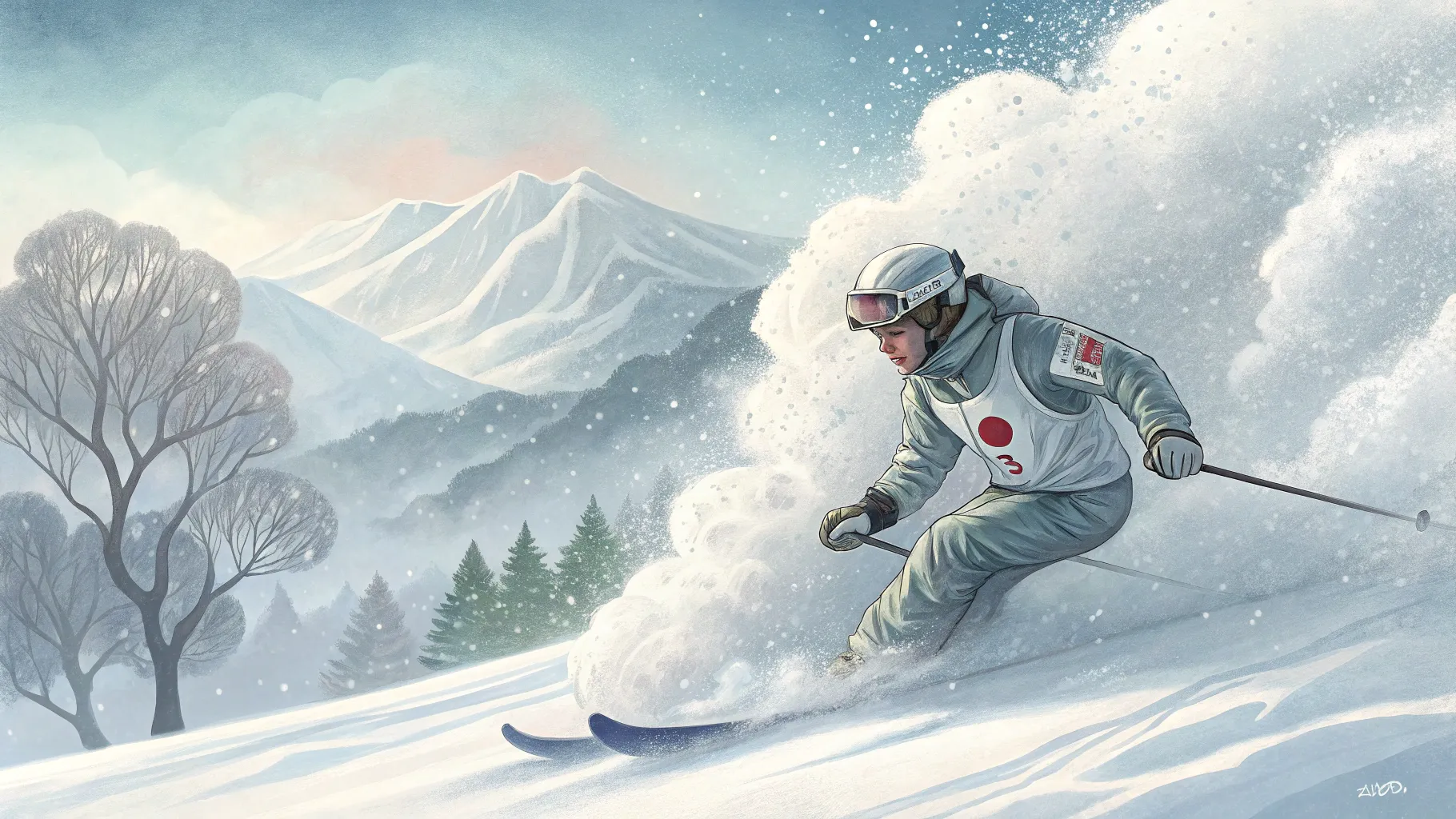 作中では、雪の質や風の冷たさ、急斜面を滑り降りる疾走感が巧みに表現されています。